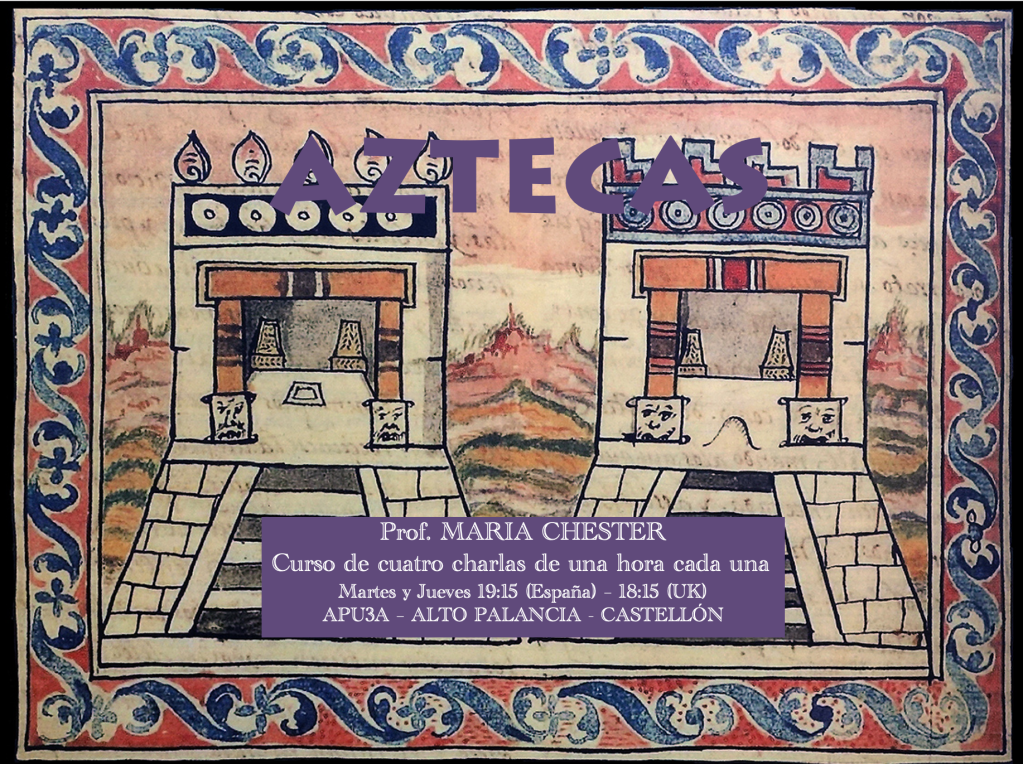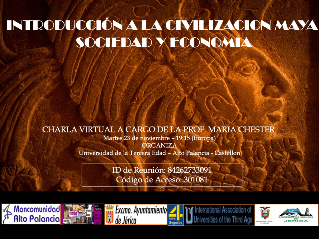 ALTO PALANCIA U3A ha organizado una serie de charlas que culminarán el ciclo de charlas dadas por la Profesora Maria Chester sobre culturas mesoamericanas. Estas charlas son parte de un programa de charlas sobre las Antiguas Civilizaciones de la América Prehispánica. Los interesados pueden visitar esta web:https://universidadterceraedadaltopalancia.blogspot.com/