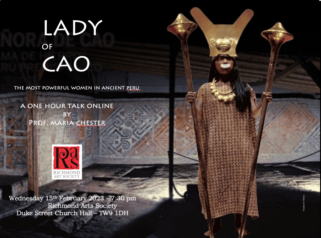 The so-called Lady of Cao tomb was found in 2006 by Peruvian archaeologist Régulo Franco Jordán and belong to the Moche civilisation. She was the most powerful woman of the north and she was buried with not one but two staffs showing her rank. This lecture was commissioned by Richmond Arts Society. If you wish to attend as a guest, you have to pay £ 5.00 per person. If you are interested in this lecture, please contact Maria Chester at: artandcivilisations@gmail.com